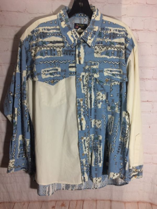 1980’s Ruddock shirt, Western style, long sleeves, button-up, abstract graphic print in color-block design, solid colored left sleeve/back yoke/right front panel under yoke, pale blue/white, size XL As is