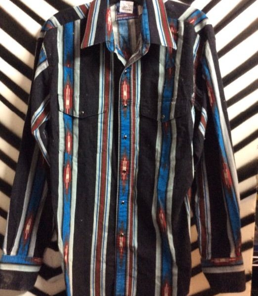 Wrangler western shirt, long sleeve button-up, black/blue Aztec print design, size L
