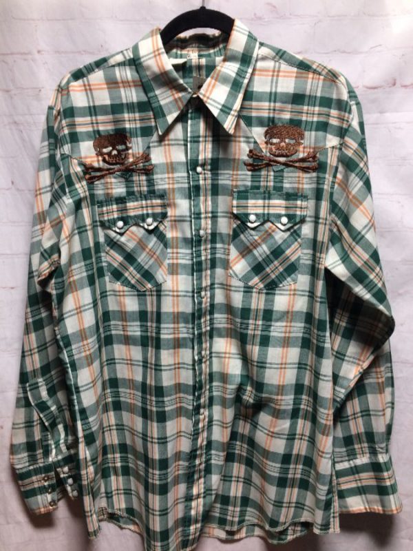 Western shirt, long sleeve, button-up with snaps, plaid print, snap-up front pockets, embroidered front skull/crossbones & Fuck Your Team on back, white/green/orange/brown, size M