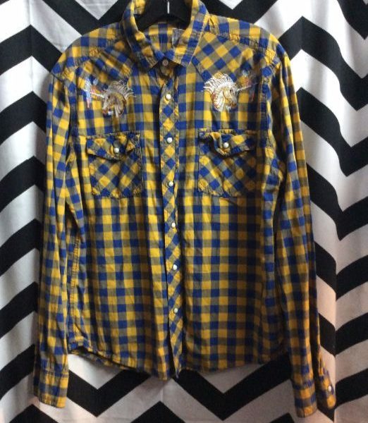 Western shirt, long sleeve button-up with pearl buttons, embroidered Unicorn design, yellow/blue, size S