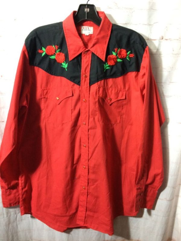 Ely Diamond Western shirt, long sleeves, button-up with pearl snaps, contrasting yoke with embroidered roses front and back, snap-up front pockets, red/black/green, size L As is