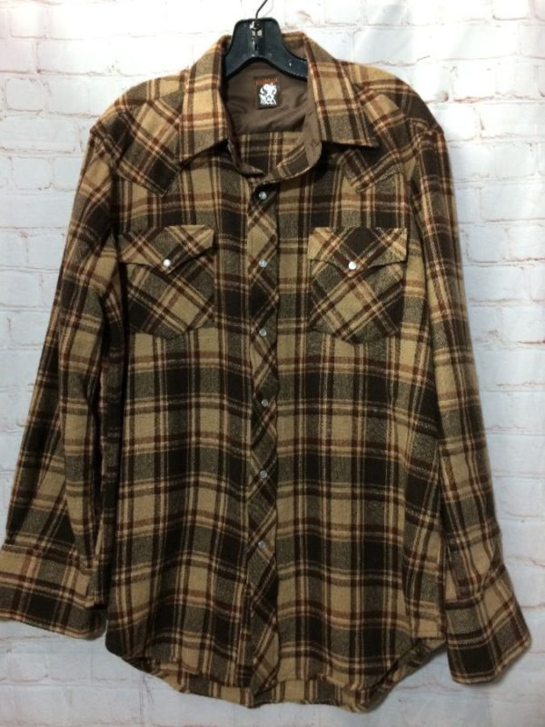 Karman flannel shirt, wool blend, long sleeves, button-up with pearl snaps, plaid print, tan/brown/gray