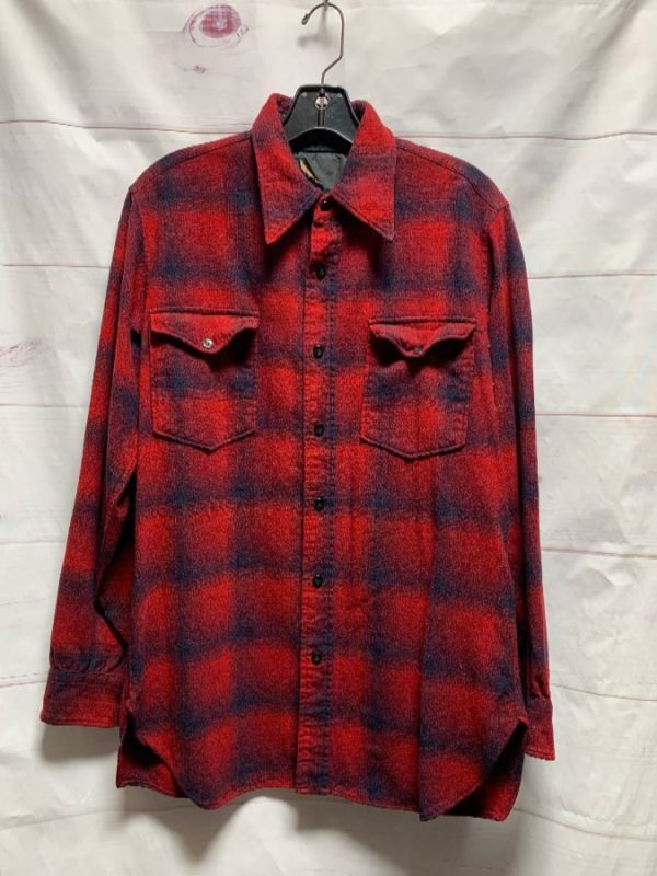PENDLETON FLANNEL SHIRT, WOOL, LONG SLEEVES, BUTTON-UP, PLAID DESIGN, 2 FRONT BUTTON-UP POCKETS, DISTRESSED, RED/BLUE, SIZE L AS IS