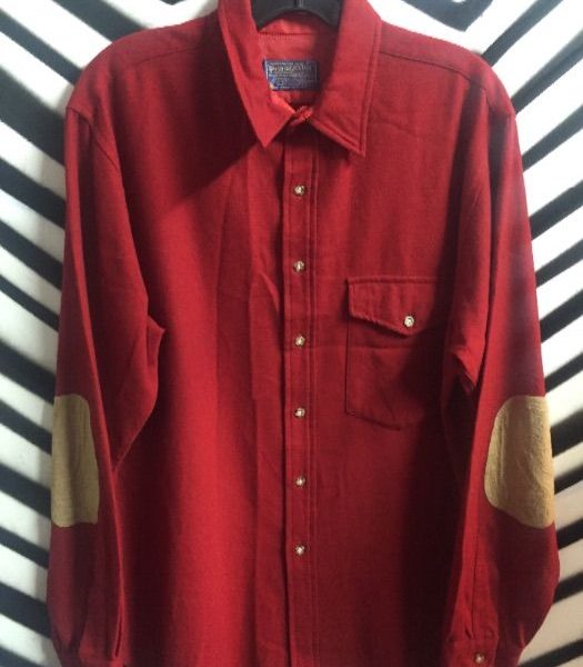 Pendleton wool shirt, red with tan elbow patches, long sleeve button up, size L