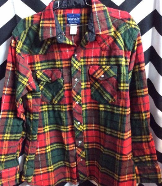 Wrangler flannel shirt, long sleeve, button-up, pearl snaps, plaid design, red/green/yellow, size XL