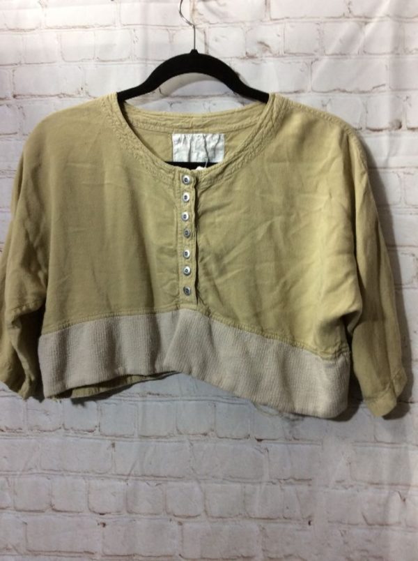 At Last top, cropped, long sleeves, half button-up, scoop neck, batwing sleeves, ribbed band on bottom, tan/creme, size S. As is