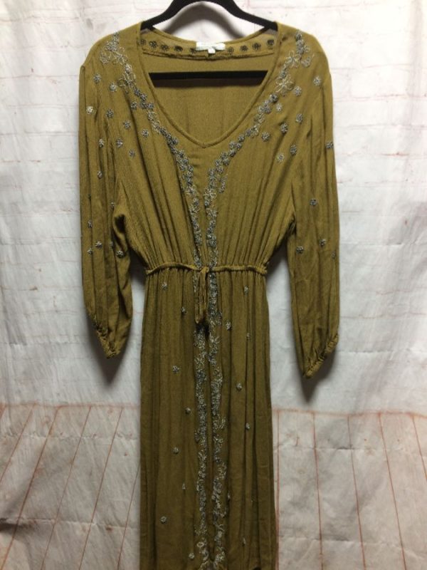 World Market dress, long sleeves with elastic, tied cinch waist, embroidered small flowers, olive green, size S/M