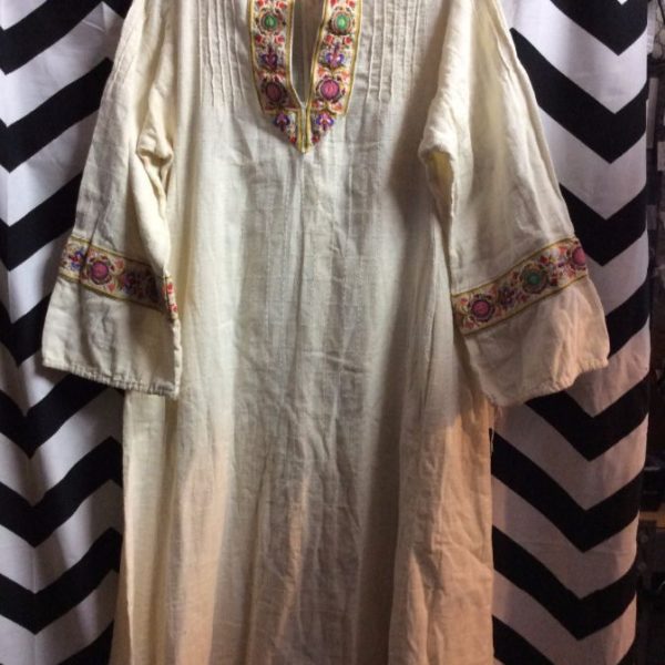 1970’s style caftan dress, zip-up back, cotton, v-neck, long sleeves, embroidered neck and sleeve bands, creme/multi, size L