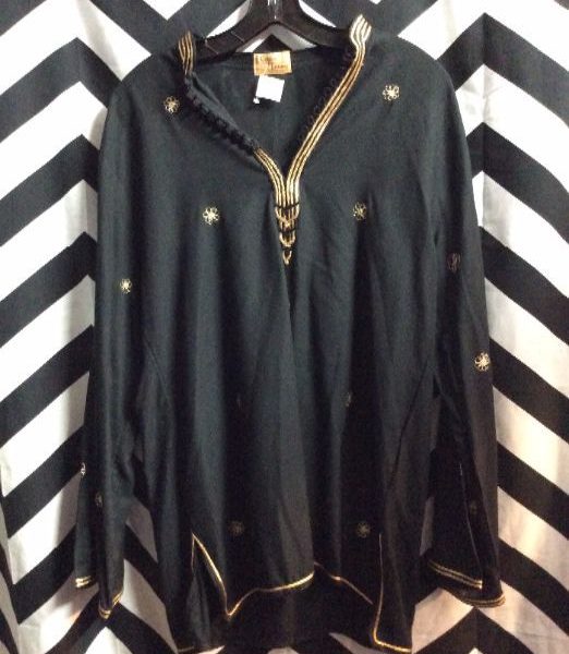 Shirt, pullover, long sleeves, India cotton, floral embroidery, contrasting bands around hem/sleeves/neck, black/gold, size L