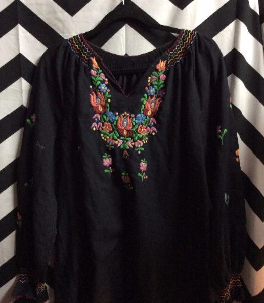 Top, long sleeves, peasant style, floral embroidery around neck and down sleeves, black/multi, size M