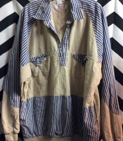 Reebok heavy pullover shirt, cotton, long sleeve, solid and striped design, blue/tan, size M