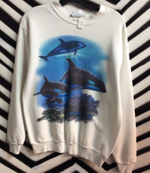 Sea World pullover sweatshirt, killer whale silk screened design, white shirt with blue design, size S