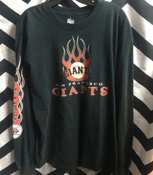 SF Giants T-shirt, long sleeves, flame design, screen printed, black/orange, size XL