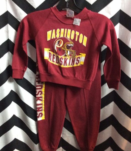 SWEATSHIRT/PANTS OUTFIT, PULLOVER, LONG SLEEVES, WASHINGTON REDSKINS, SCREEN PRINTED DESIGNS FULL FRONT & DOWN RIGHT LEG, MAROON/YELLOW/WHITE