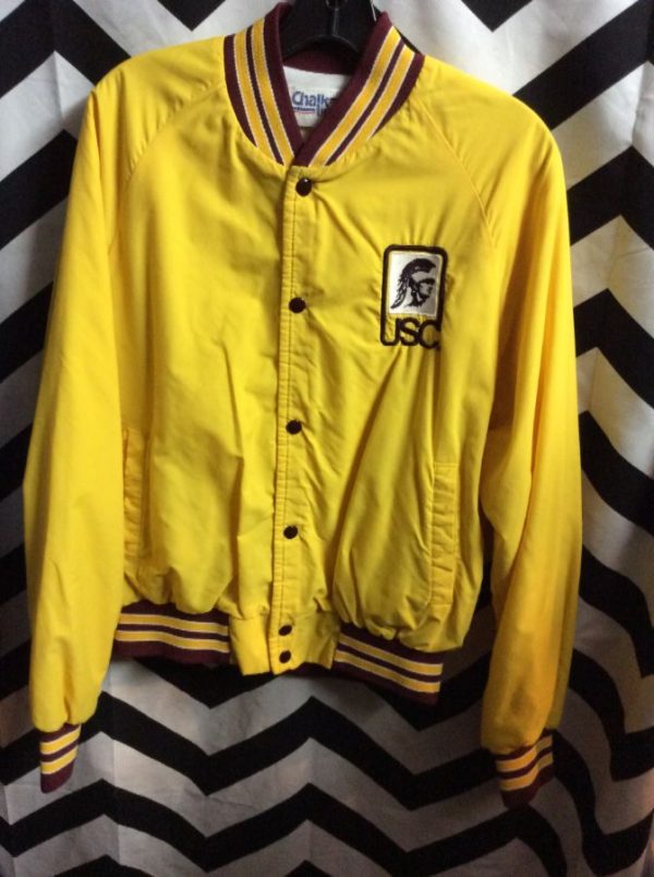 Vintage Chalk Line bomber jacket, USC Trojans, logo patch, embroidered outline & lettering, striped trim, yellow/maroon, size M