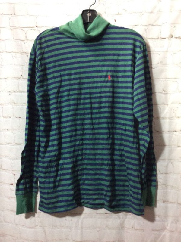 Polo sweatshirt, pullover, long sleeves, turtle neck, horizontal stripes design, small left chest logo, green/navy, size M