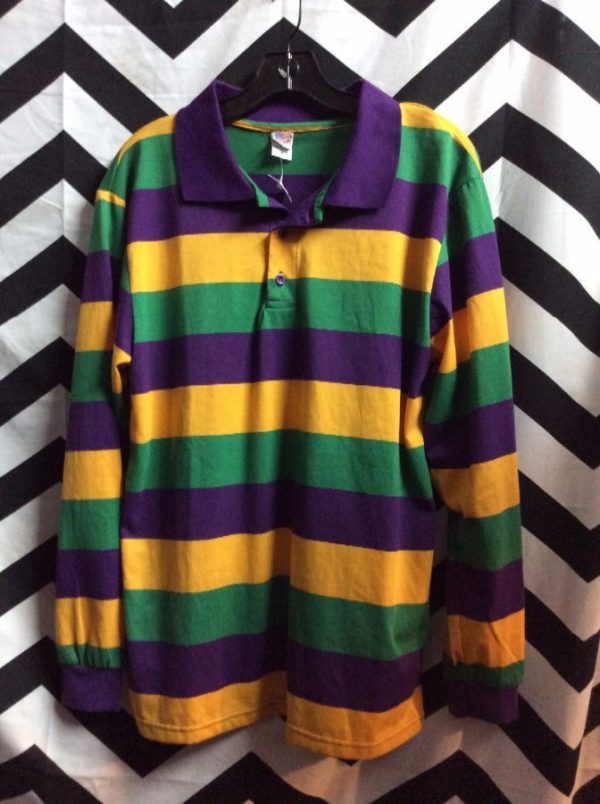 Shirt, polo style, long sleeves, button-up neck, horizontal stripe design, yellow/green/purple, size S