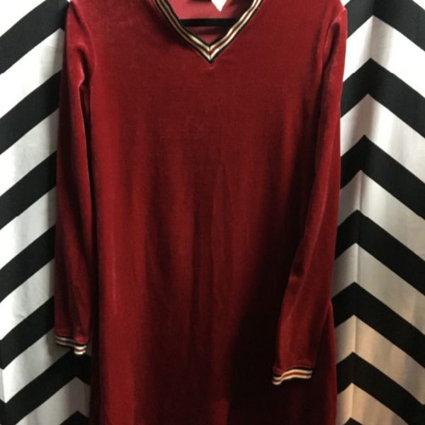 DRESS, VELVET, MINI, LONG SLEEVE, V-NECK, STRIPED RIBBED COLLAR & CUFFS, MAROON/BLACK/CREME