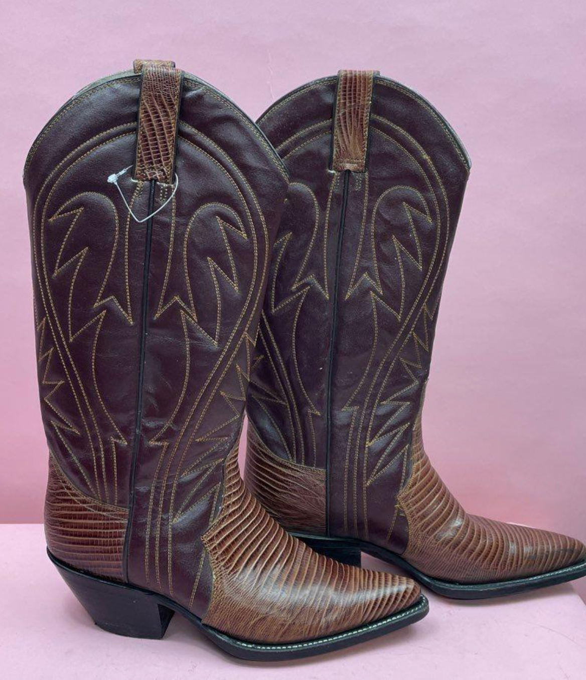 AS-IS AMAZING WHIP STITCH BROWN AND TAN LEATHER COWBOY BOOTS SZ 6M