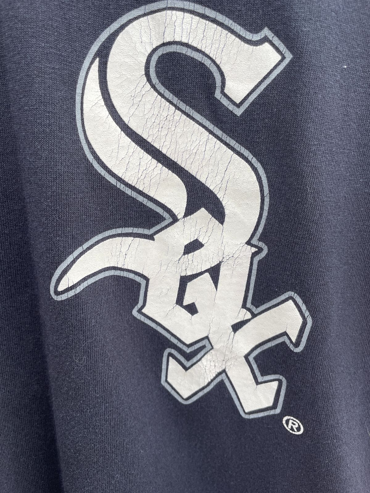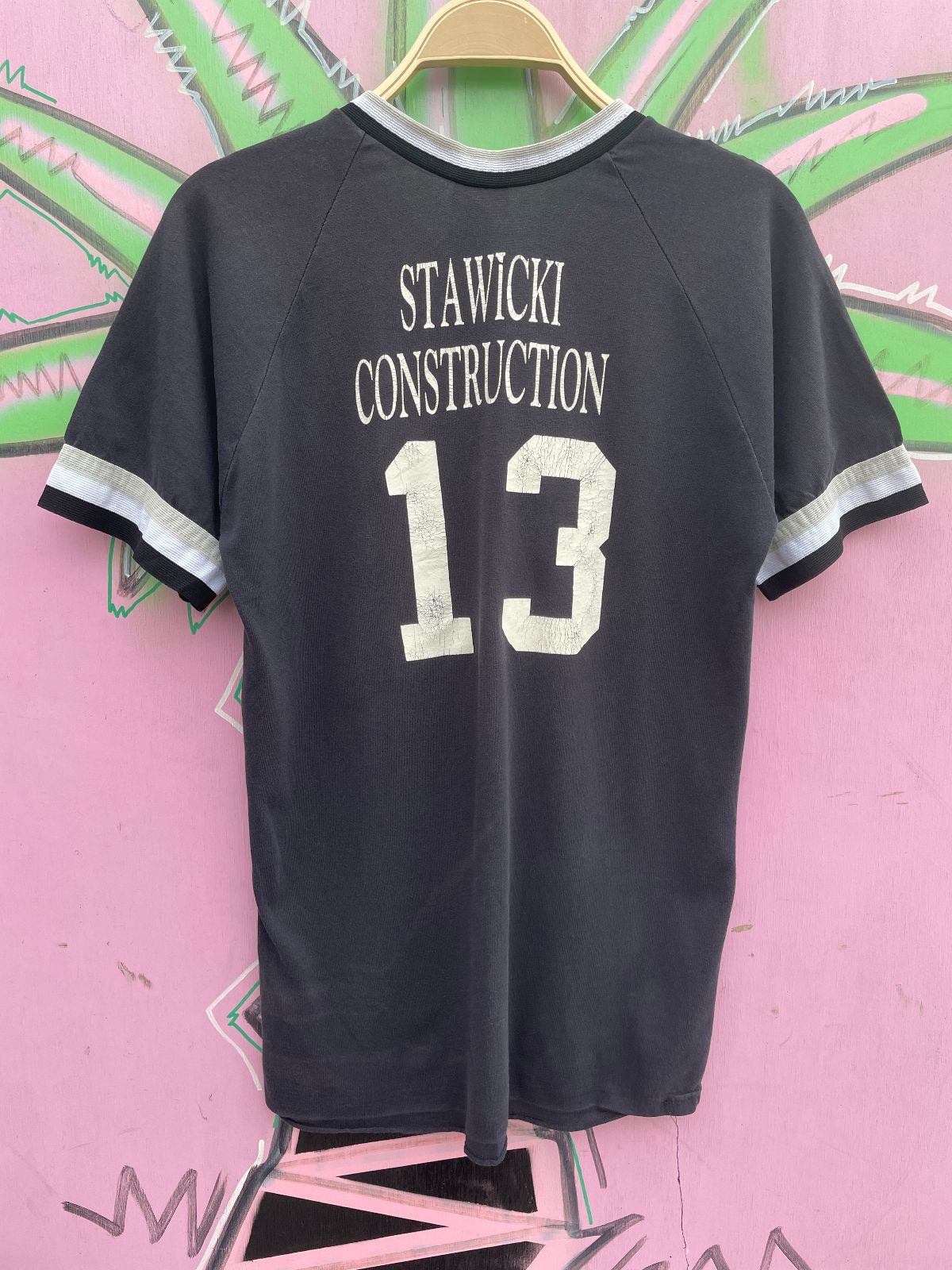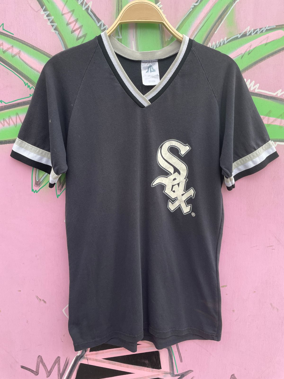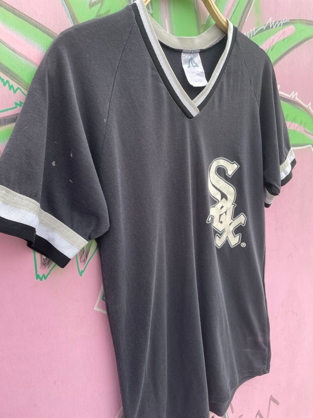 MADE IN U.S.A. CHICAGO WHITE SOX LOGO V NECK RINGER TEE, STAWICKI CONSTRUCTION #13
