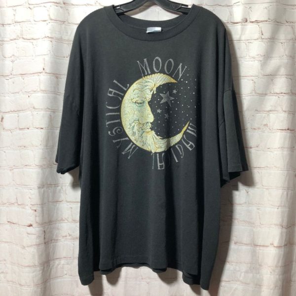 Hanes T-shirt, 50/50 cotton/poly, Magical Mystical Moon screen printed front graphic with the man in the moon/stars & lettering, black/white/off-white, size XXXL As is