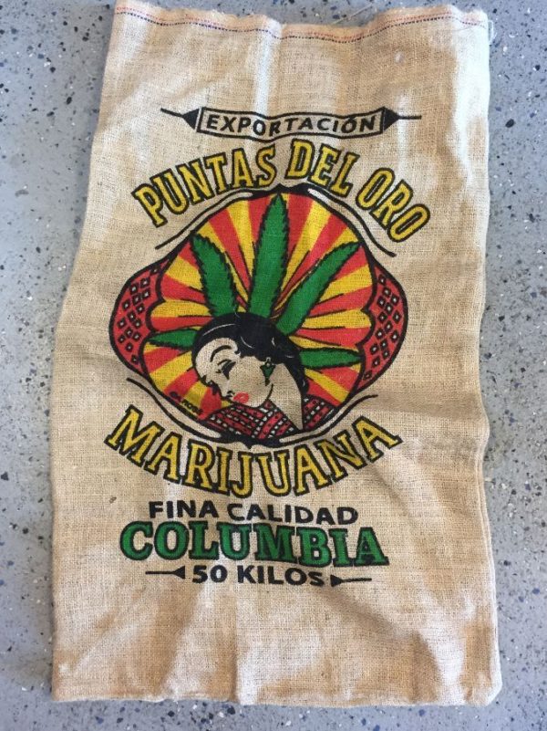 50 KILO BURLAP SACK, FRONT DESIGN WITH LETTERING/WOMAN/POT PLANT GRAPHIC PRINT, SCREEN PRINTED FINE QUALITY COLUMBIA GOLD MARIJUANA EXPORT (IN SPANISH), BEIGE/GREEN/RED/YELLOW/BLACK
