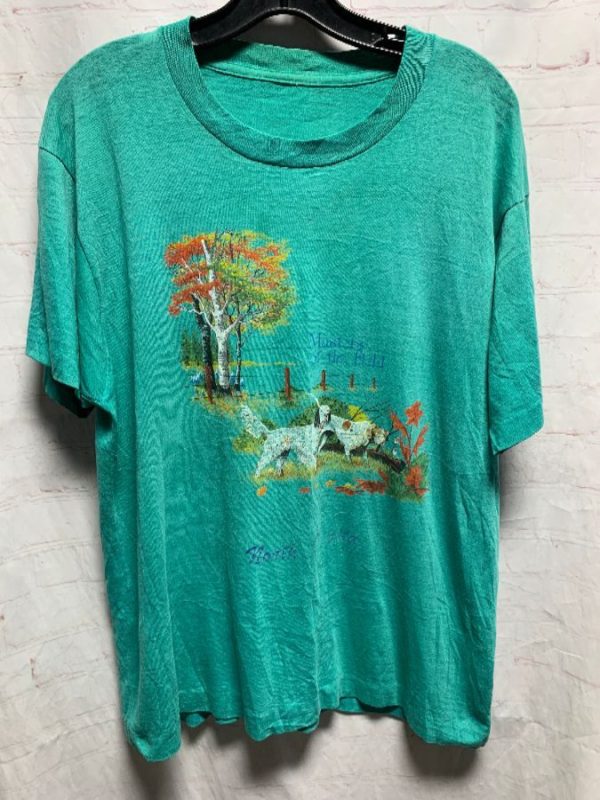 T-shirt, super thin, Masters of the Field, North Dakota, screen printed front graphic with lettering/dogs/fall scenery, black/teal/blue/white/brown/orange, size L As is