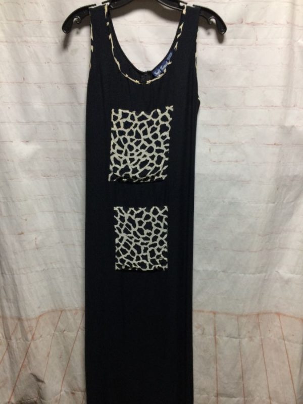 Soft Touch dress, rayon, sleeveless tank style top, zip-up back, maxi length, 2 animal print squares down front & trim around neck/sleeves, black/white, size S