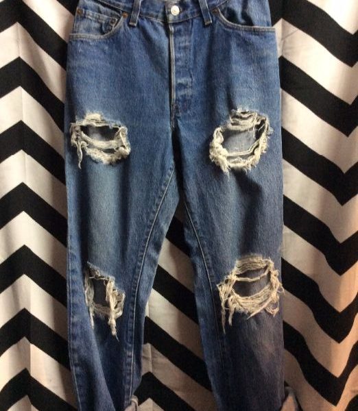 LEVIS DENIM JEANS – RED TAB – BUTTON FLY MED SOFT FOUR TORN HOLES