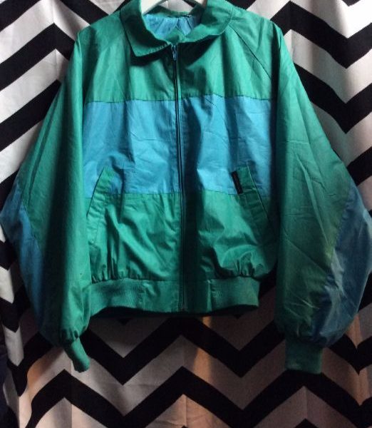 Members Only windbreaker jacket, zip-up, pastel color block design, teal/green, size L