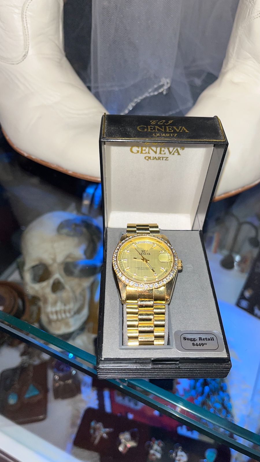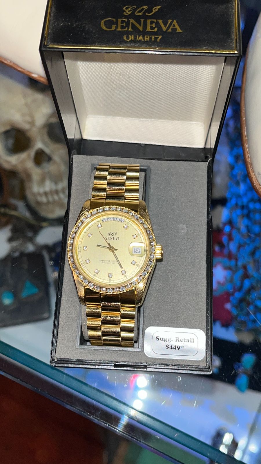 MENS FANCY GOLD PLATED WRIST WATCH, RHINESTONE BEZEL – NEW IN BOX