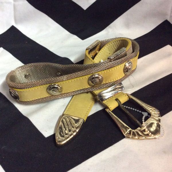 Mesh metal and leather belt with chunky hardware, yellow/gold, size L