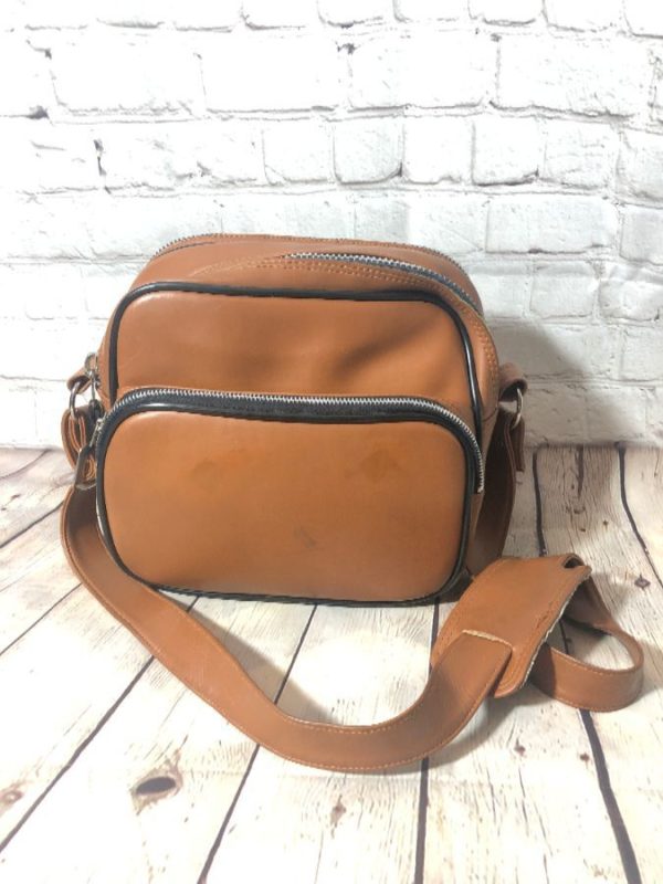 Retro 1960’s-1970’s Kalt messenger bag, camera/travel style, vinyl, shoulder strap, 3 compartments with zippered closures, tan as is