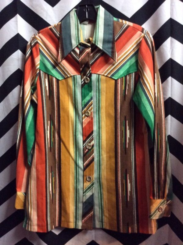 1970’s, jacket, long sleeves, button-up, Mexican blanket print, orange/brown/green