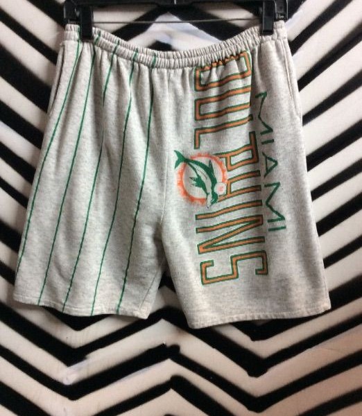 Miami Dolphins sweat-pant shorts, silk screened design down left leg, grey shorts with green pinstripes
