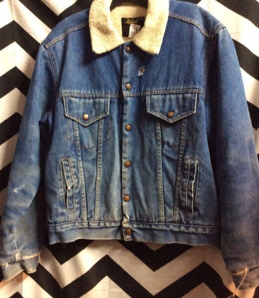 Michael Charles denim jacket, Sherpa lined and collar, button-up, blue/creme, size L