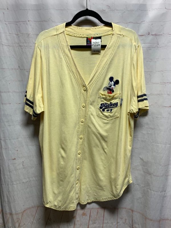 Mickey Unlimited baseball style jersey, cotton, short sleeves, button-up, v-neck, striped sleeve trim, embroidered Mickey Mouse design above left chest pocket & Mickey #1 across pocket, creme/red/white/black/navy blue, size XXL As is