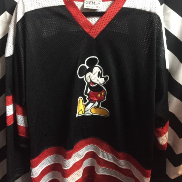 Pullover hockey jersey, v-neck, appliques – Mickey Mouse graphic on front & Mickey #1 letters on back, black/white/red/yellow, size L