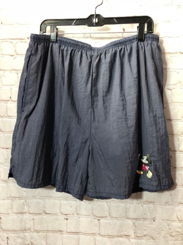 Disney swim trunks, elastic waist, embroidered Mickey Mouse cartoon & American flag design block lettering, navy/red/yellow/white, size XL