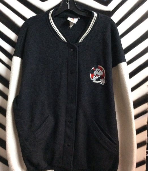 Disney Mickey Mouse fleece jacket, two-toned, button-up, embroidered design, black/white as is