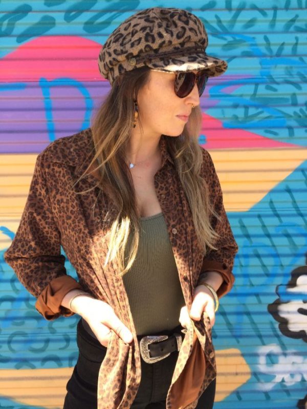 White Stag shirt, micro suede, long sleeves, button-up, collar, leopard print, brown/black, size M