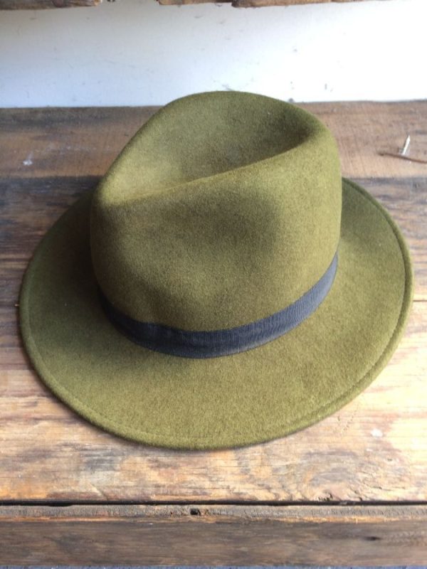 Hat, Fedora style, wool felt, contrasting ribbon hat band, military green/blue violet, size M