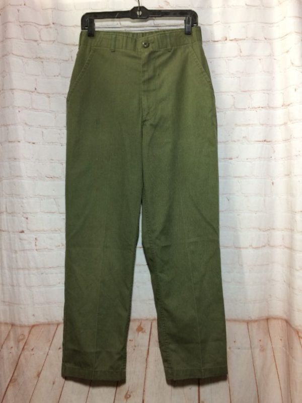 Military Issued service pants, zip-up, fitted waist with belt loops, front pockets, back pockets with flaps & buttons, Halvorson embroidered above right back pocket, olive green, size 30W x 29L