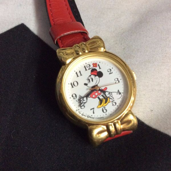 Minnie Mouse watch with colorful leather band, red band/white face/red/black/gold