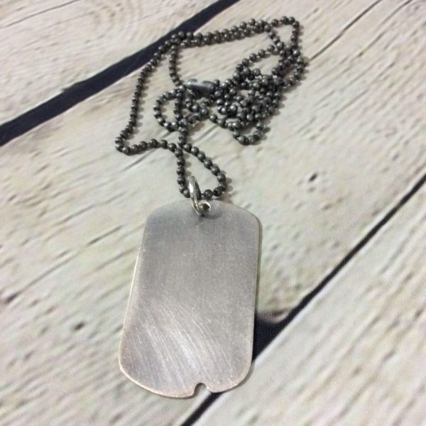 Mkt Price necklace, antique silver metal dog tag, ball chain, silver/gun metal gray, size long