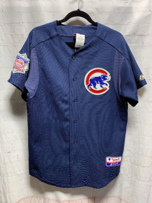 Majestic baseball jersey, short sleeves, button-up, v-neck, Chicago Cubs, # 23 Sansil, appliqued lettering, embroidered bear cub logo & National league patches, screen printed manufactures logo on sleeve, MLB, blue/white/red, size M