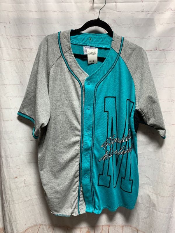 Starter baseball jersey, short sleeves, button-up, v-neck, striped trim on sleeves/around neck & down front placket, Florida Marlins, half & half front color, color-block design, embroidered team design & name, gray/teal, size L