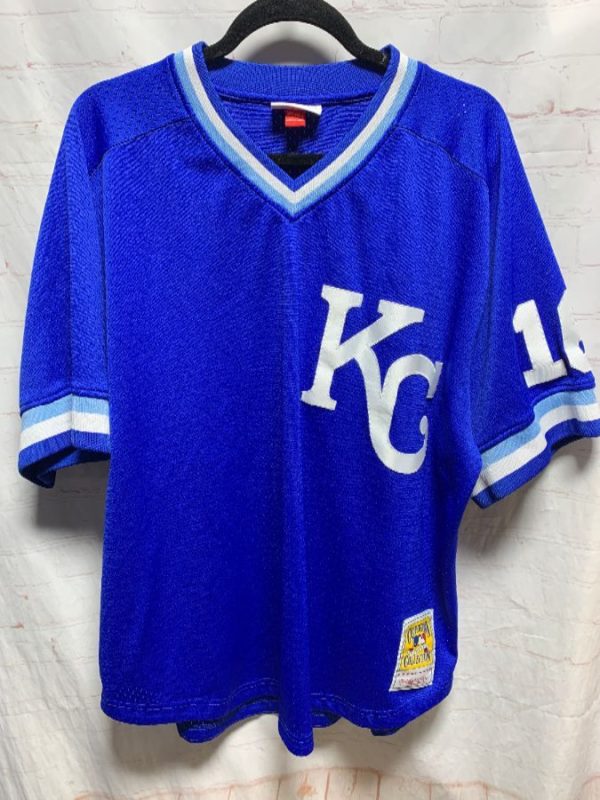 Mitchell & Ness baseball jersey, pullover, v-neck, athletic mesh, striped trim on collar & sleeves, Kansas City Royals #16 throwback jersey, screen printed lettering/number, MLB, blue/white, size XXL
