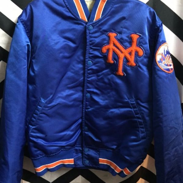 Starter jacket, button-up, New York Mets, team patches, MLB, blue/orange, size M as is