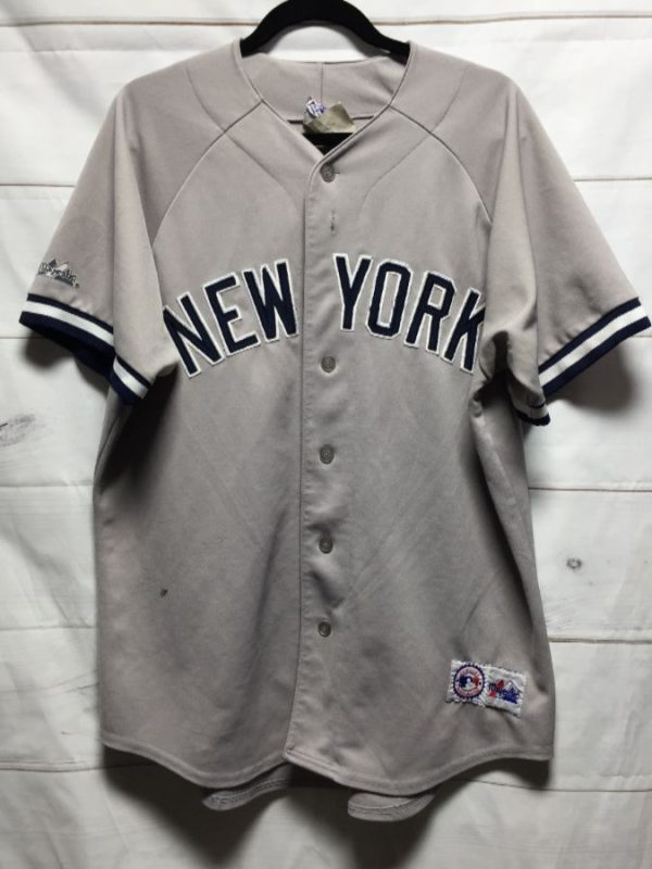 Majestic baseball jersey, short sleeves, button-up, v-neck, striped trim on sleeves, New York Yankees, appliqued lettering, MLB, gray/white/black, size L As is